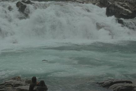 wodospad Laksfossen i skaczące łososie